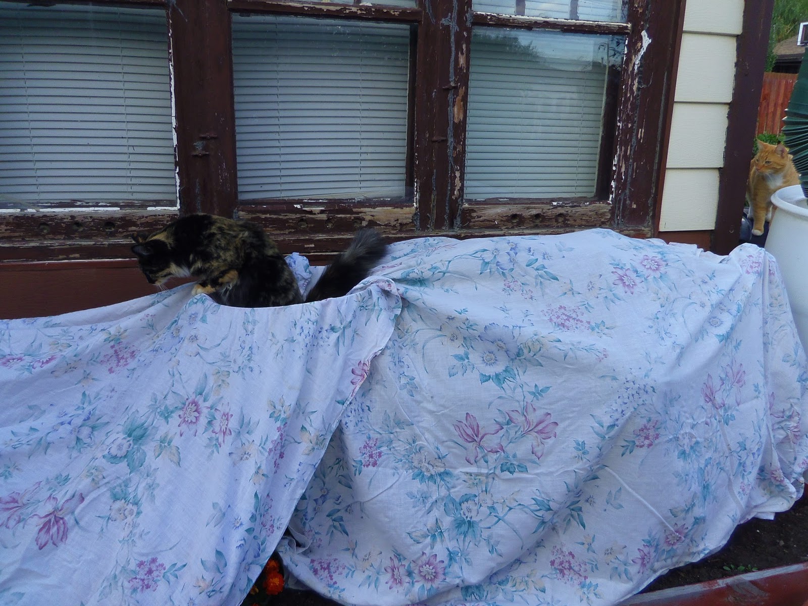 Their frost-cover-fort exploration complete, kitties are now inside snoozing, one on the computer chair, and one on the bed. :)